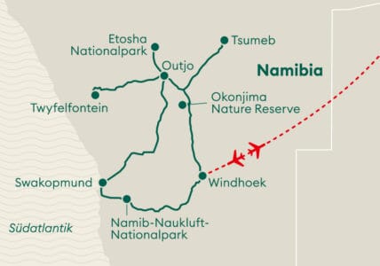 Gewaltige Canyons, einsame Berglandschaften und eines der letzten Urvölker, die die Erde zu bieten hat, prägen die bizarre, ungezähmte Schönheit. Das mit Euphorbien-Sträuchern und gewaltigen, rotgetünchten Basaltbergen gespickte Areal ist Faszination und Ursprünglichkeit zugleich. Unweit des Atlantiks erwarten Sie mit dem Brandbergmassiv die höchsten Gebirgszüge Namibias und uralte Bäume säumen von vertrockneten Flüssen durchzogene Täler. Begegnen Sie dem Vogelstrauss mit seinen neugierigen Knopfaugen und blicken Sie hinter das Geheimnis der einzigartigen Twyfelfontein-Felsgravuren.