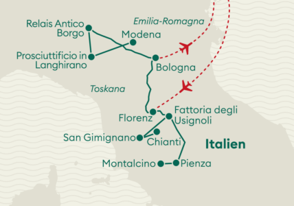 Von der Toskana führt Ihre Reise heute weiter in die Region Emilia-Romagna. Aus der Emilia-Romagna stammen zahlreiche der berühmtesten, kulinarischen Spezialitäten Italiens, wie der Prosciutto di Parma oder der Parmigiano.